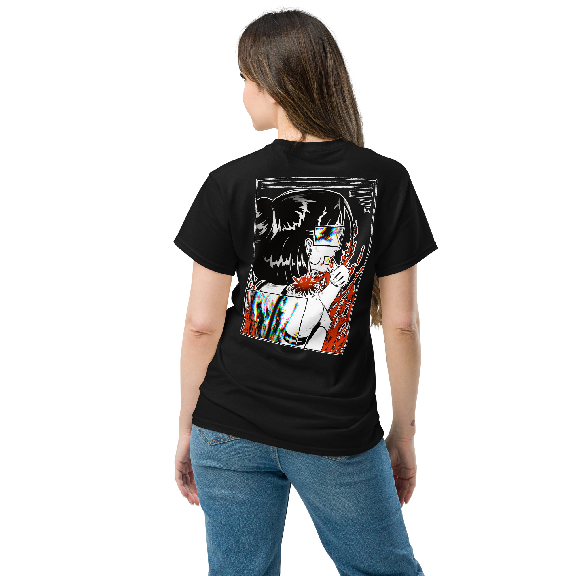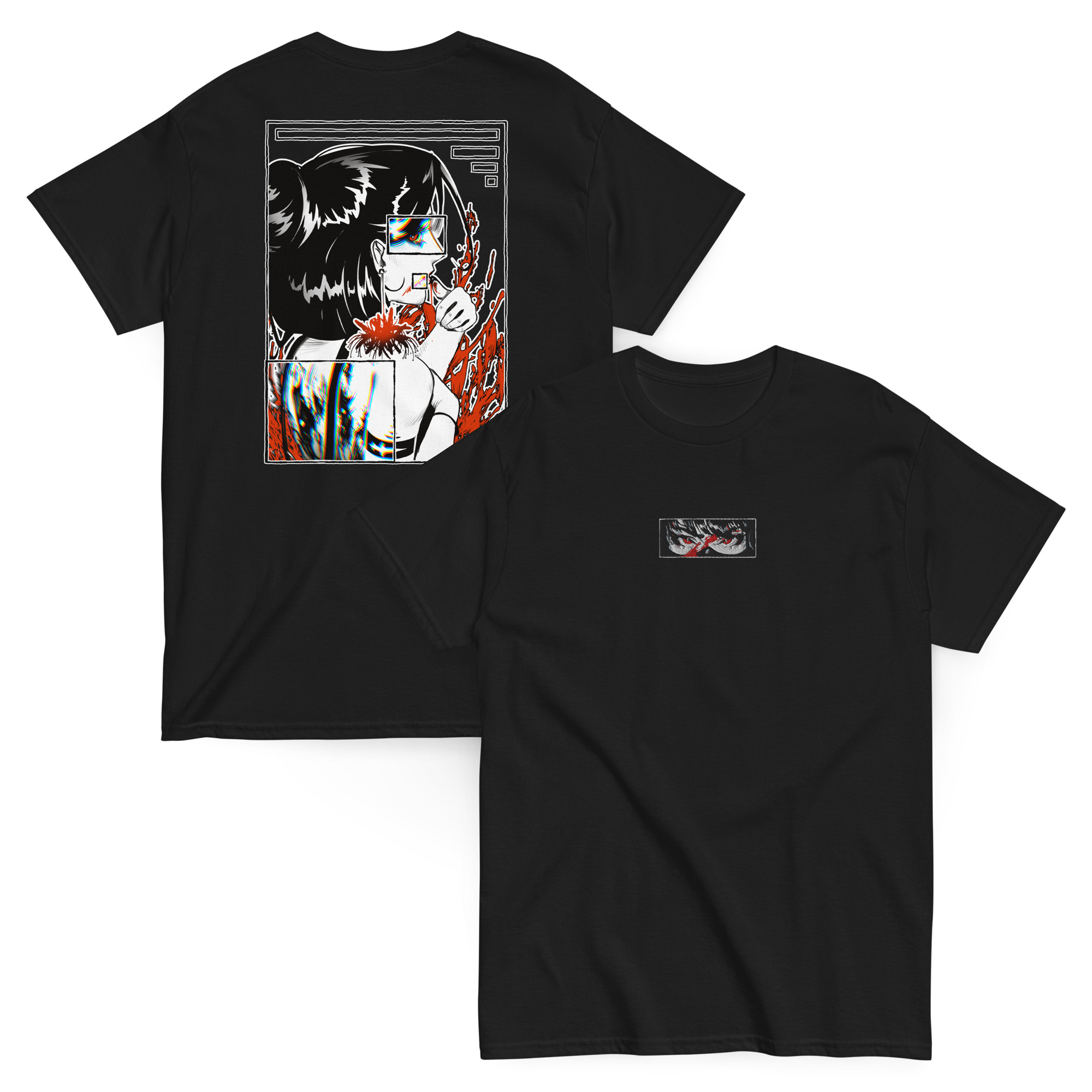 Au dos, l’illustration capture l’instant précis où la soif prend le dessus. Le portrait de profil d’une vampire est fragmenté par des cadres de distorsion : la vue et le goût sont perturbés, saturés de couleurs vives, comme un signal électrique qui s’emballe face à l’odeur du sang. De sa nuque semble jaillir une structure organique rouge vif, renforçant cette perte de contrôle sensorielle. Le style, brut et nerveux, s’éloigne des portraits statiques pour exprimer une tension viscérale.