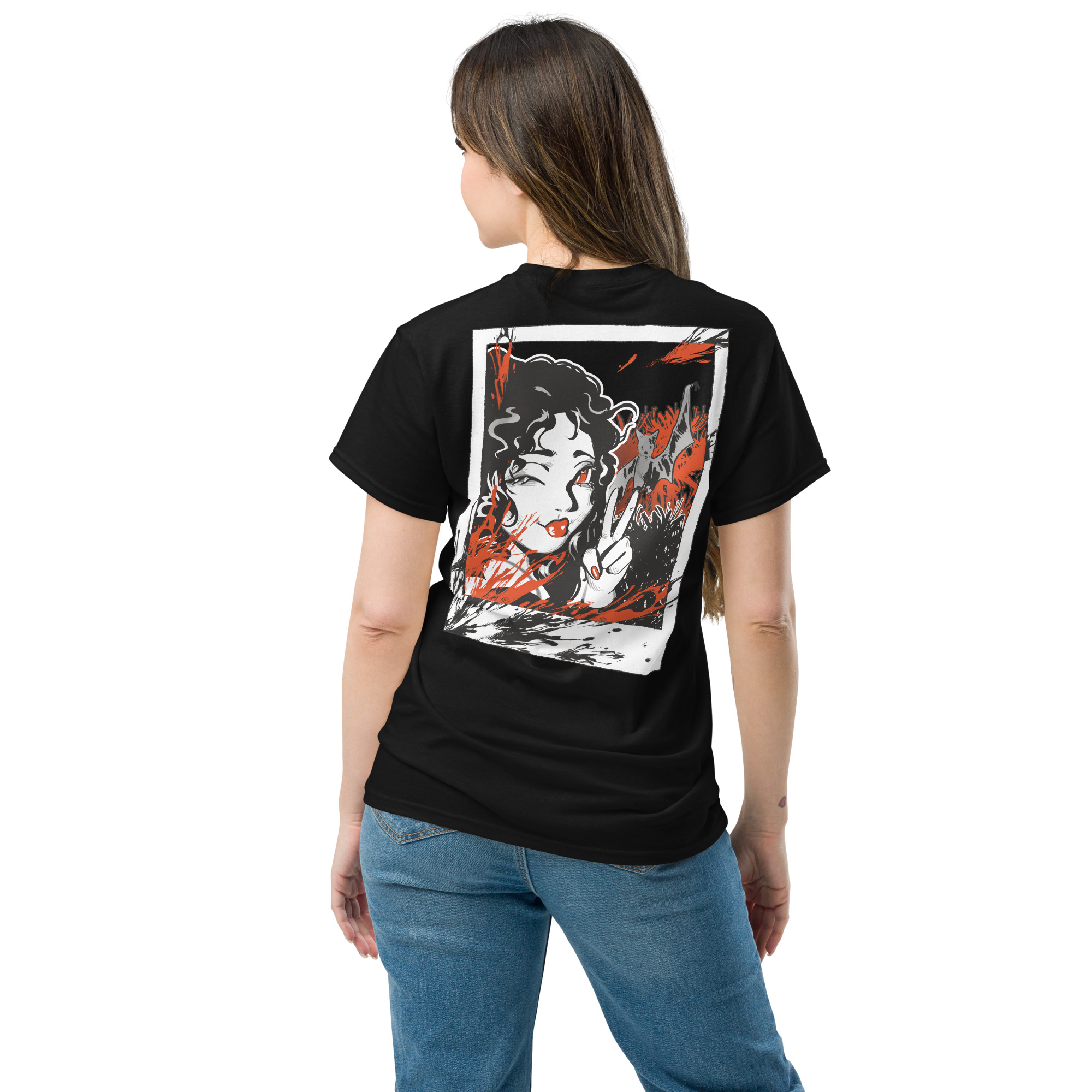 Au dos, l’illustration dévoile un visuel percutant : une vampire au regard hypnotique qui lâche un signe « peace » faussement candide. Le design joue sur les codes du Polaroid déchiré, avec un contraste noir et blanc tranchant, violemment relevé de touches de rouge sang. Accompagnée d’une chauve-souris en toile de fond, cette esthétique sombre dépoussière totalement les codes classiques du genre.