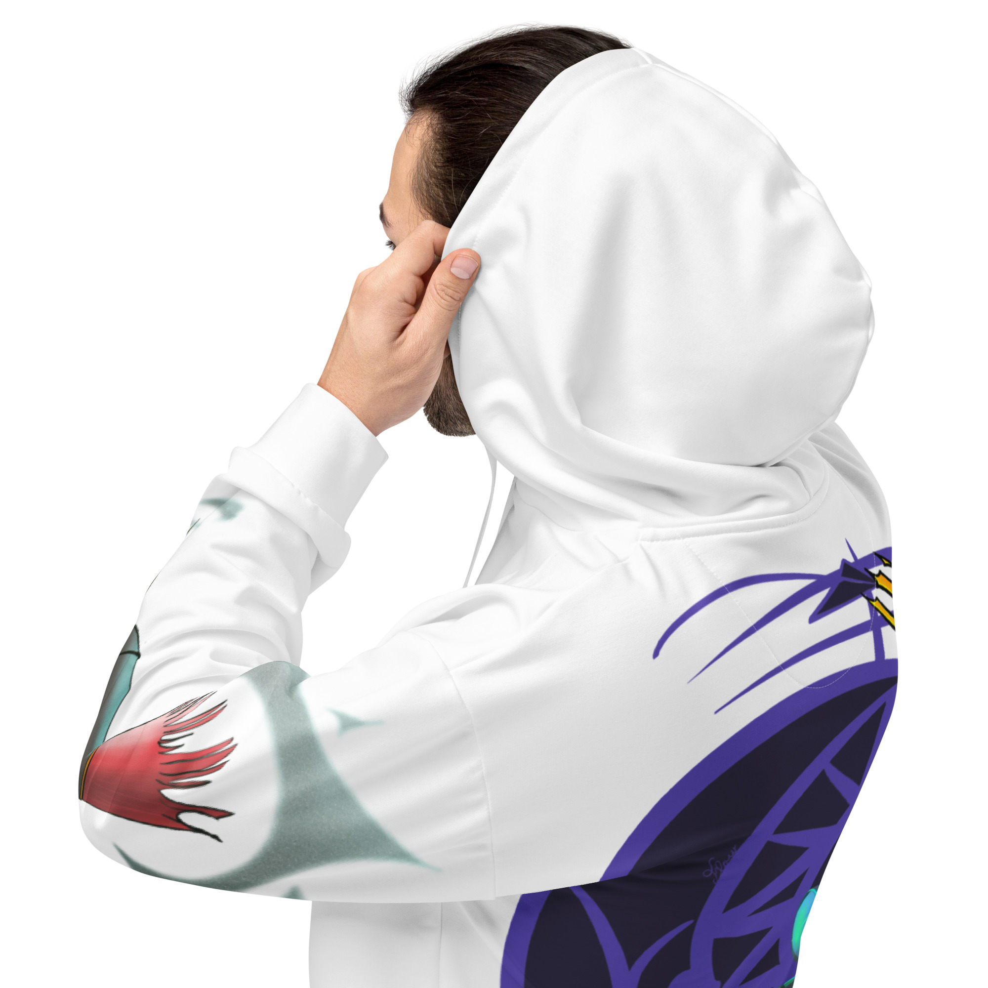 Le fond mauve, habité de monstruosités, crée un contraste inquiétant avec la maîtrise et le calme du personnage.