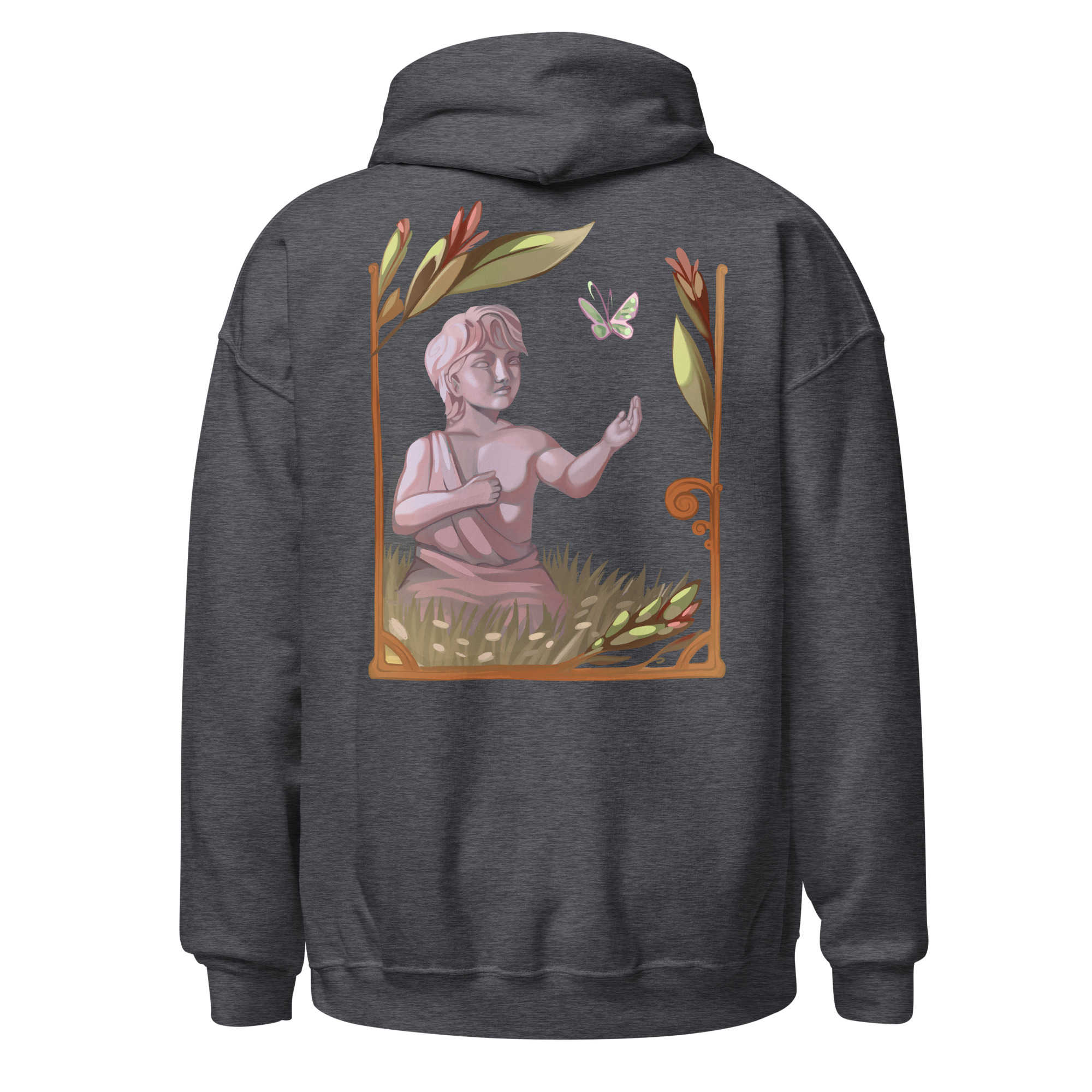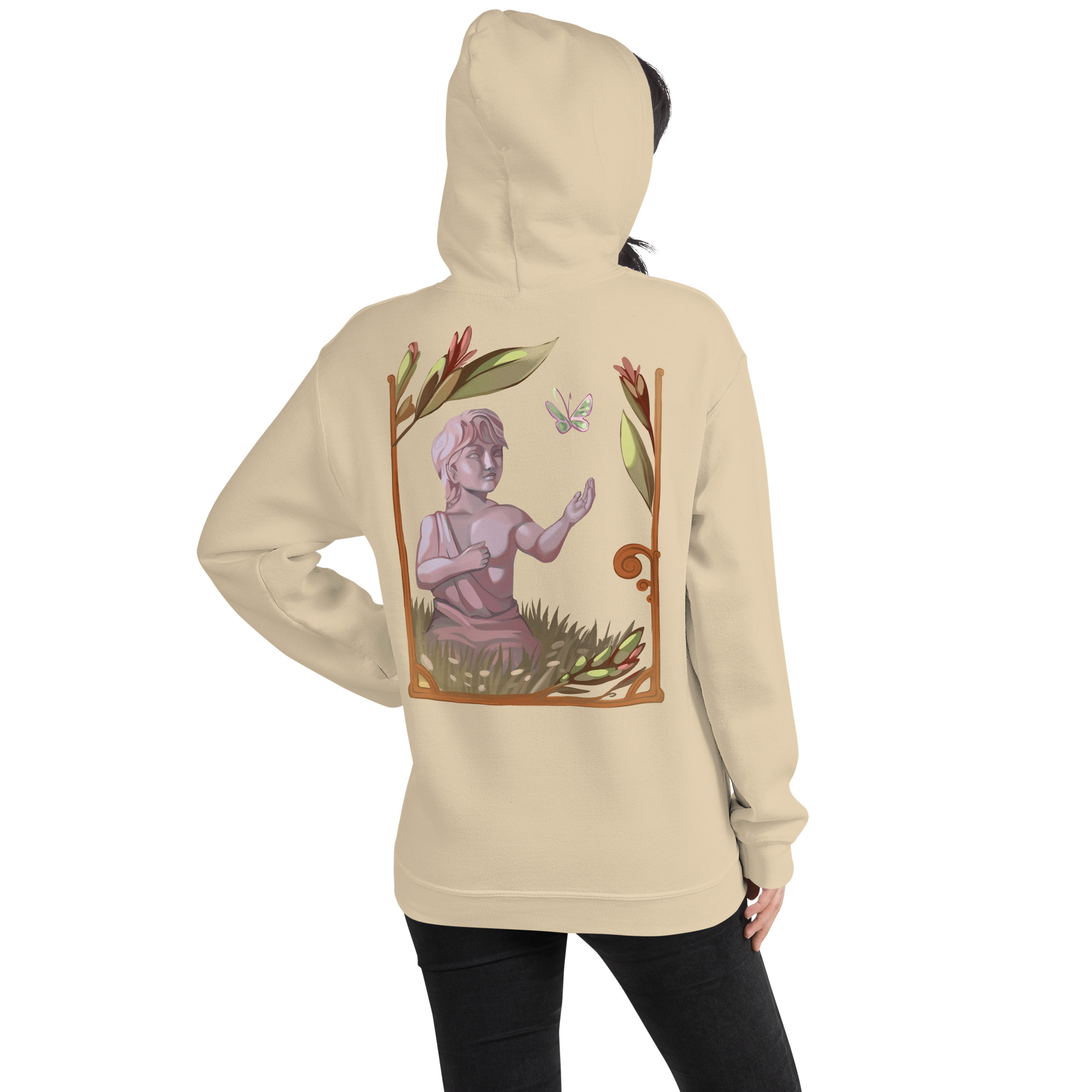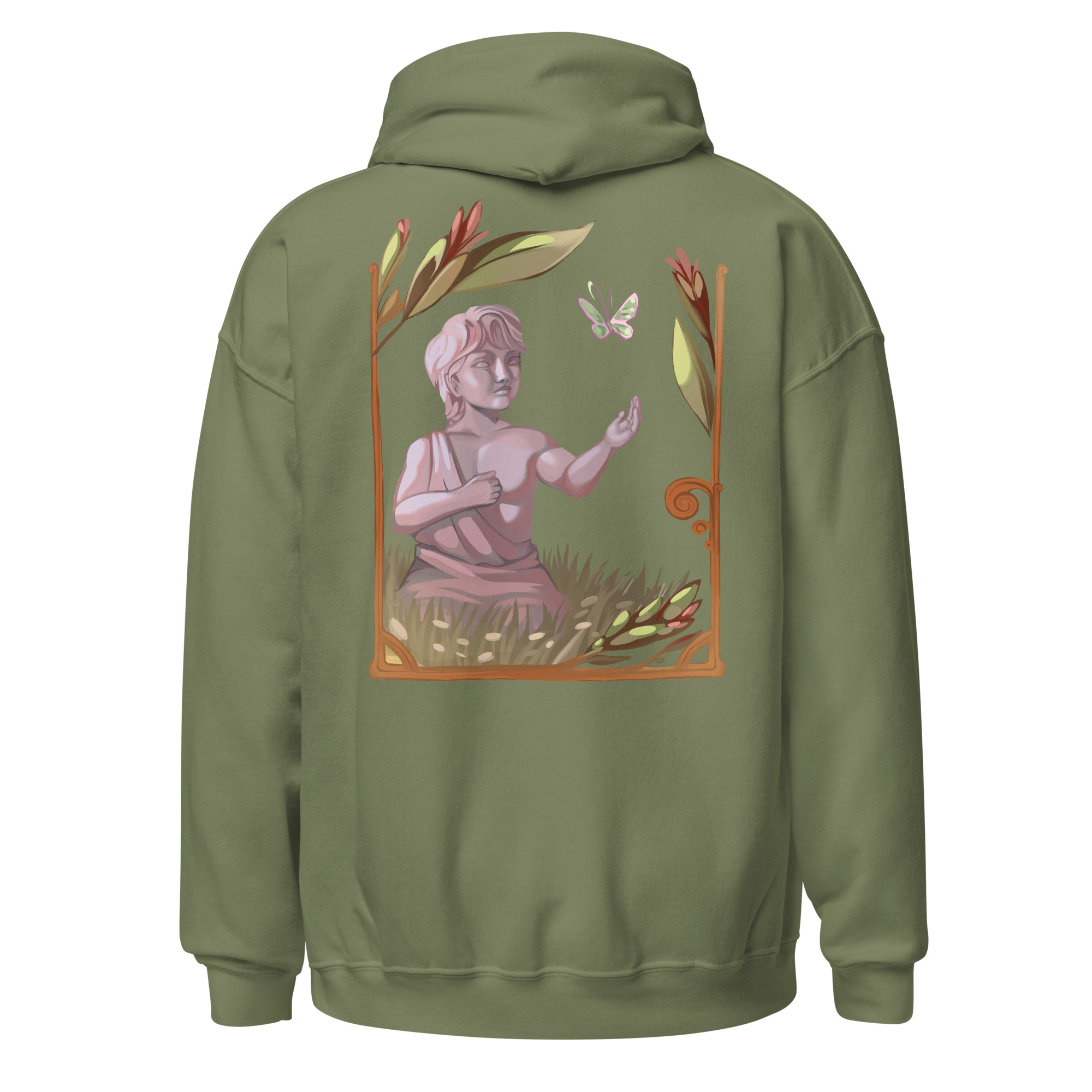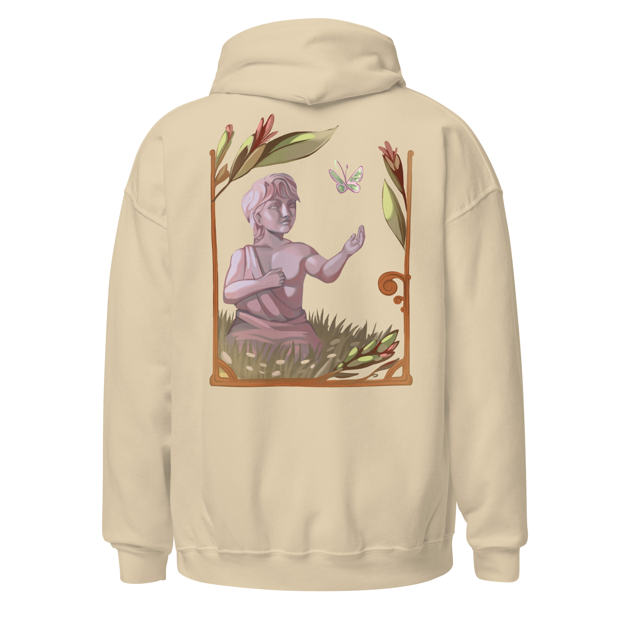 bras tendu vers un papillon qui flotte comme une pensée légère.