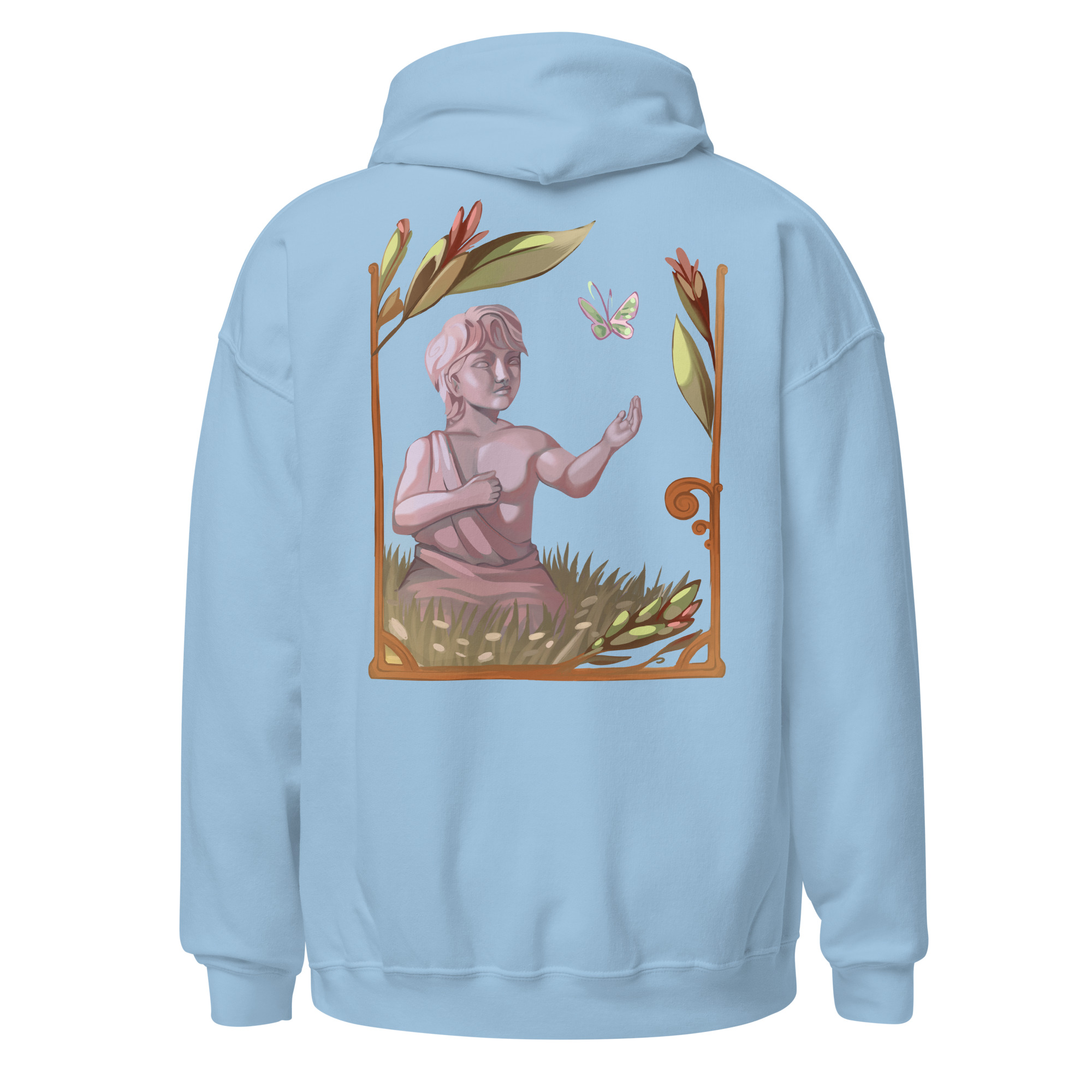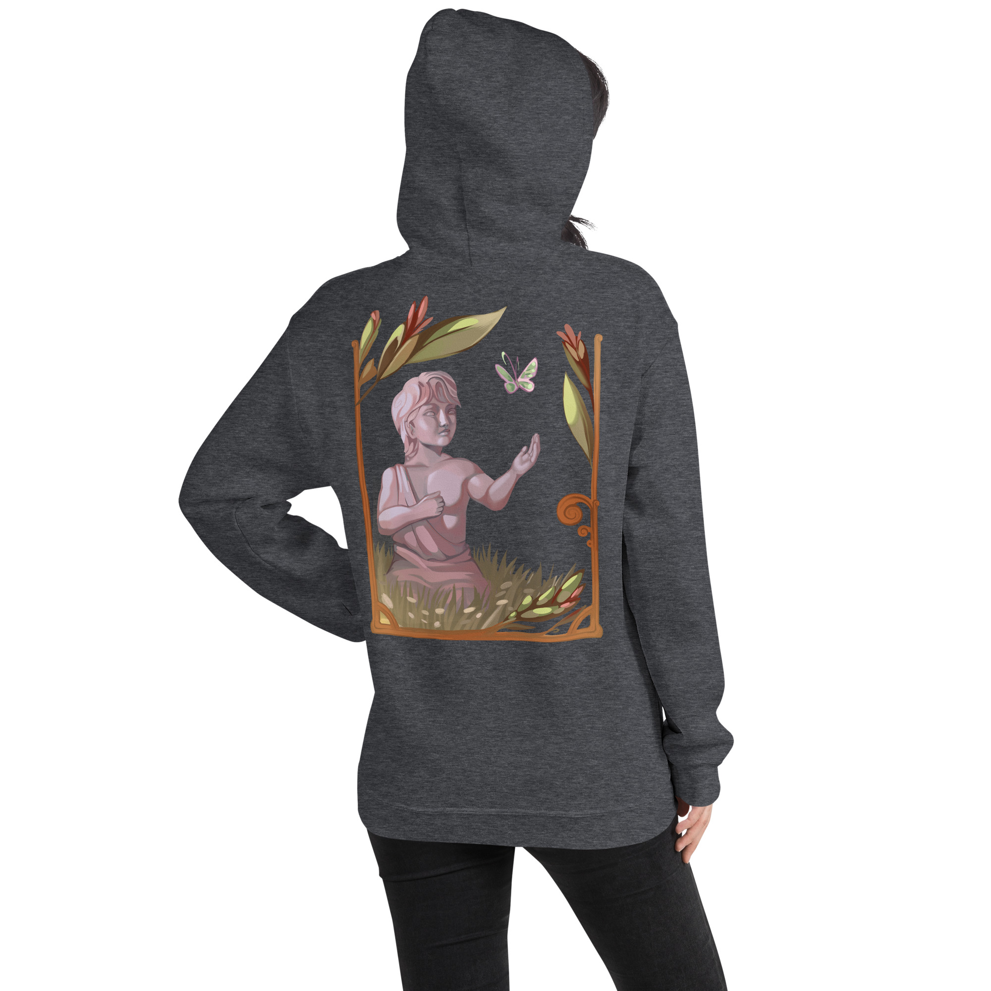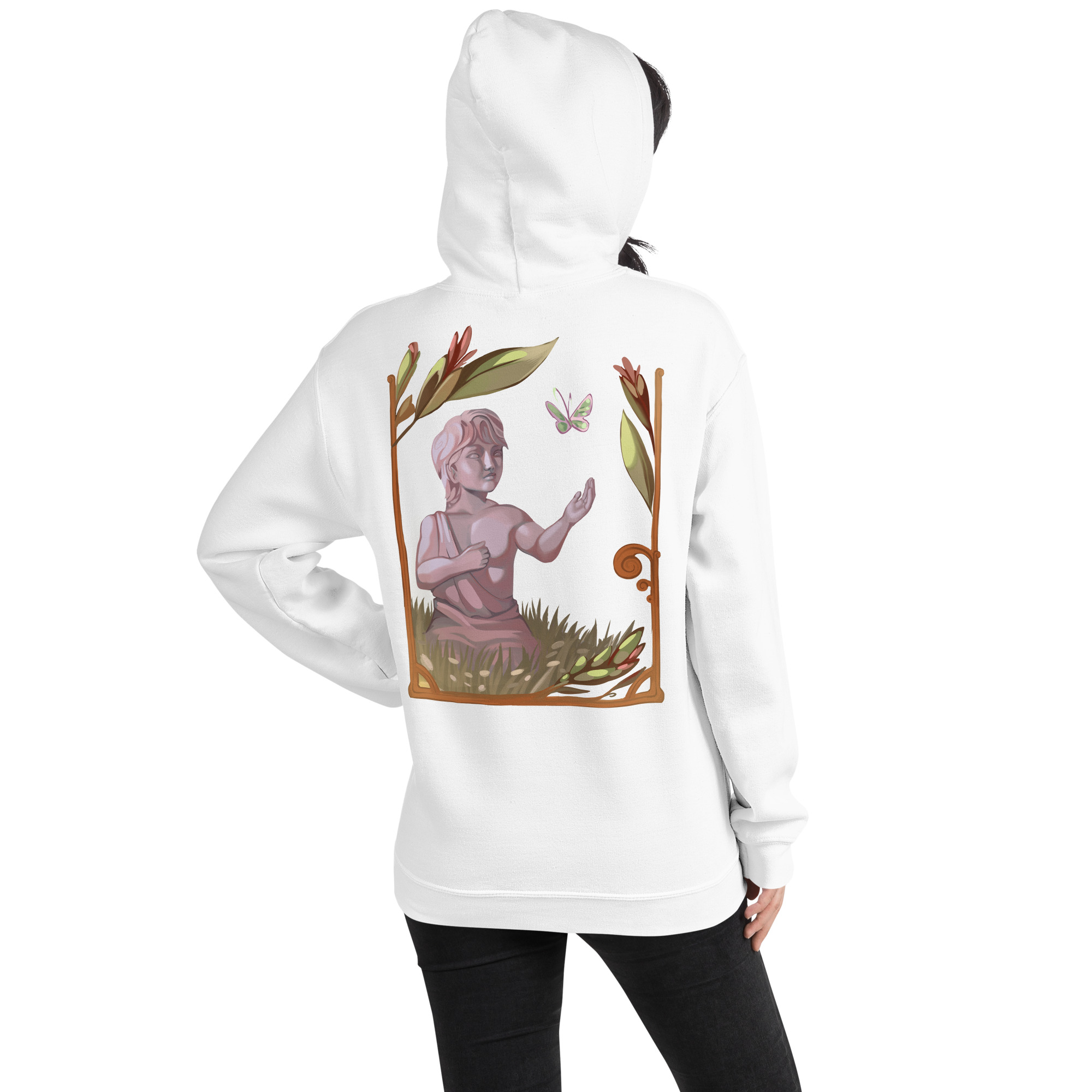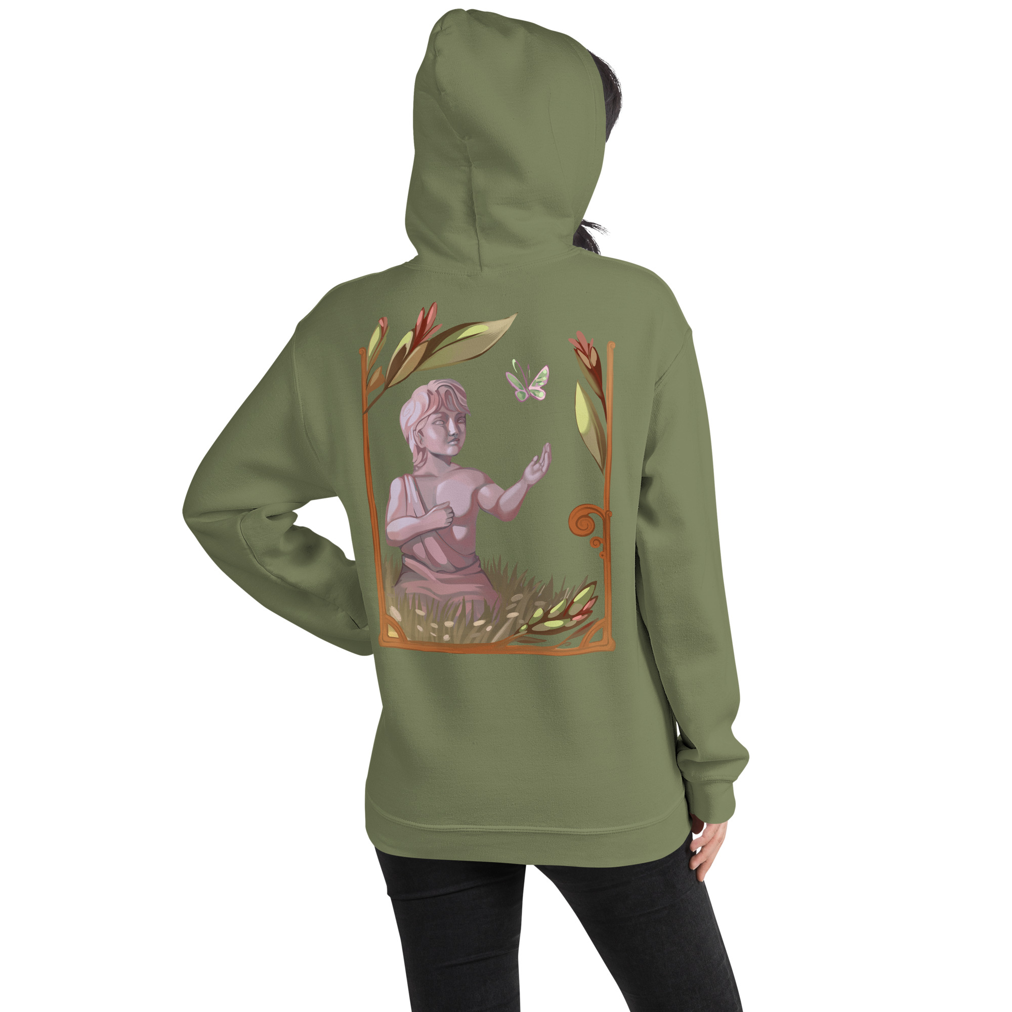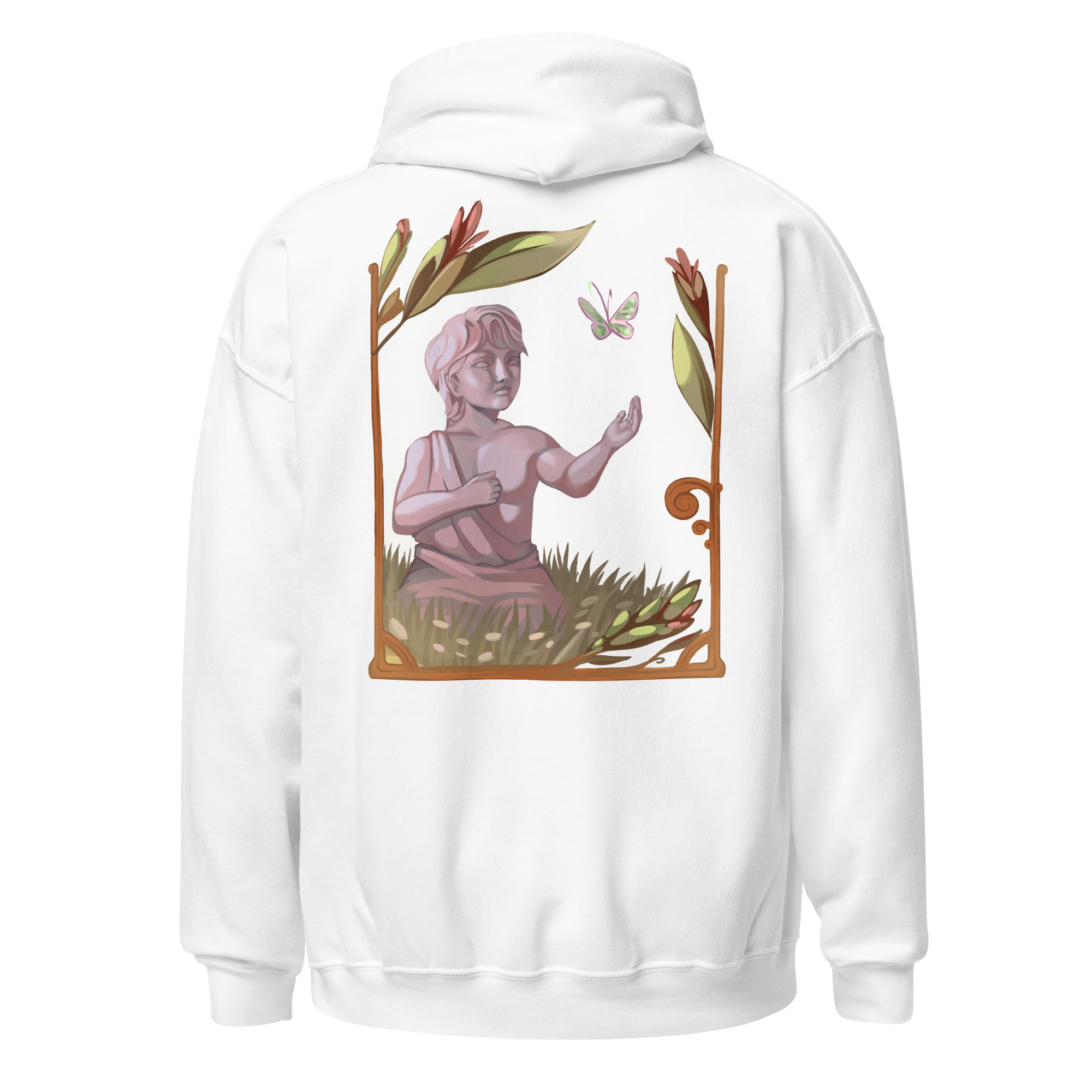 bras tendu vers un papillon qui flotte comme une pensée légère.